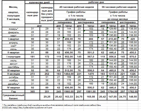 В производственном календаре приведена норма рабочего времени на месяцы, кварталы и 2022 год в целом в рабочих днях (часах). Она рассчитана по календарю пятидневной и шестидневной рабочей недели, исходя из восьми-, семи- и шестичасового рабочего дня при 40-часовой и 36-часовой рабочей неделе.