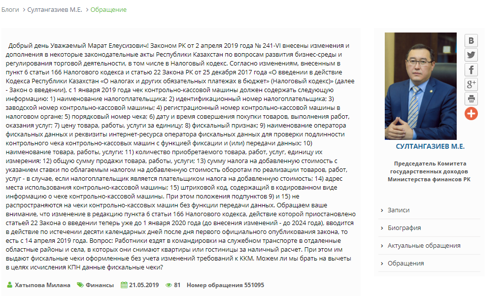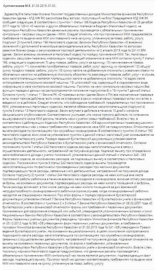 Комитет государственных доходов Министерства финансов Республики Казахстан (далее – КГД МФ РК) рассмотрев Ваш вопрос, поступивший на блог Председателя КГД МФ РК сообщает следующее. В соответствии с пунктом 1 статьи 166 Кодекса Республики Казахстан от 25 декабря 2017 года № 120-VI «О налогах и других обязательных платежах в бюджет» (Налоговый кодекс), на территории Республики Казахстан денежные расчеты производятся с обязательным применением контрольно – кассовых машин (далее – ККМ).