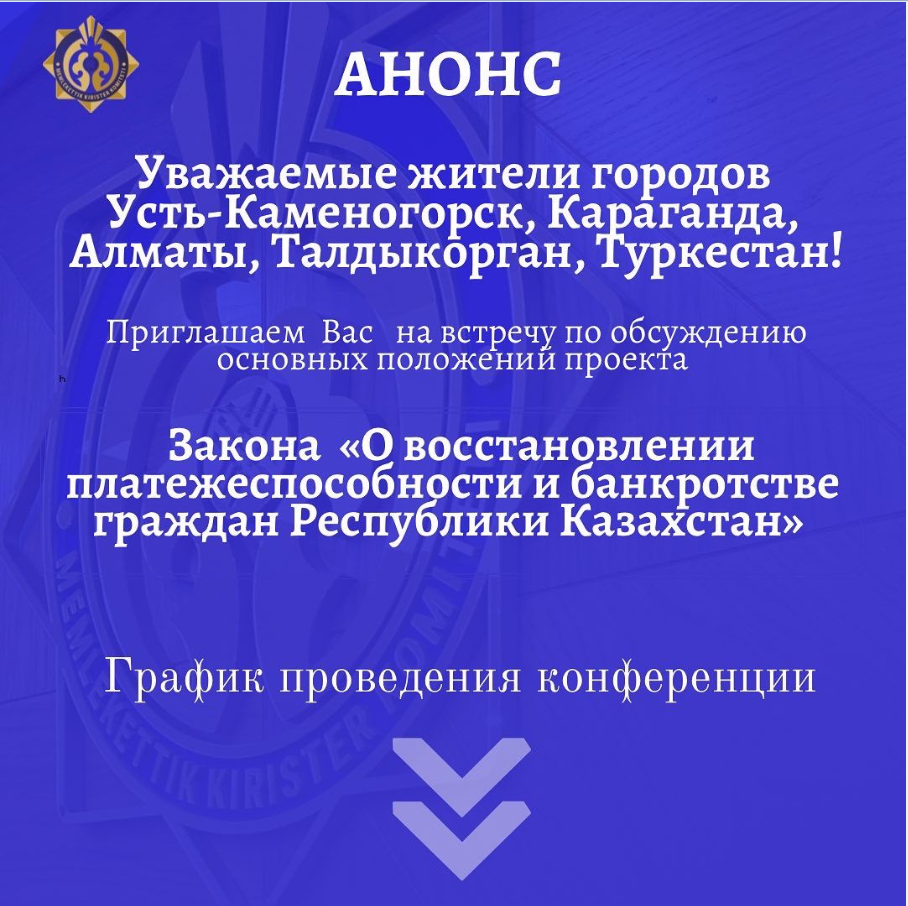 Приглашаем Вас принять участие в мероприятии, посвященном разъяснению основных положений проекта Закона «О восстановлении платежеспособности и банкротстве граждан Республики Казахстан».