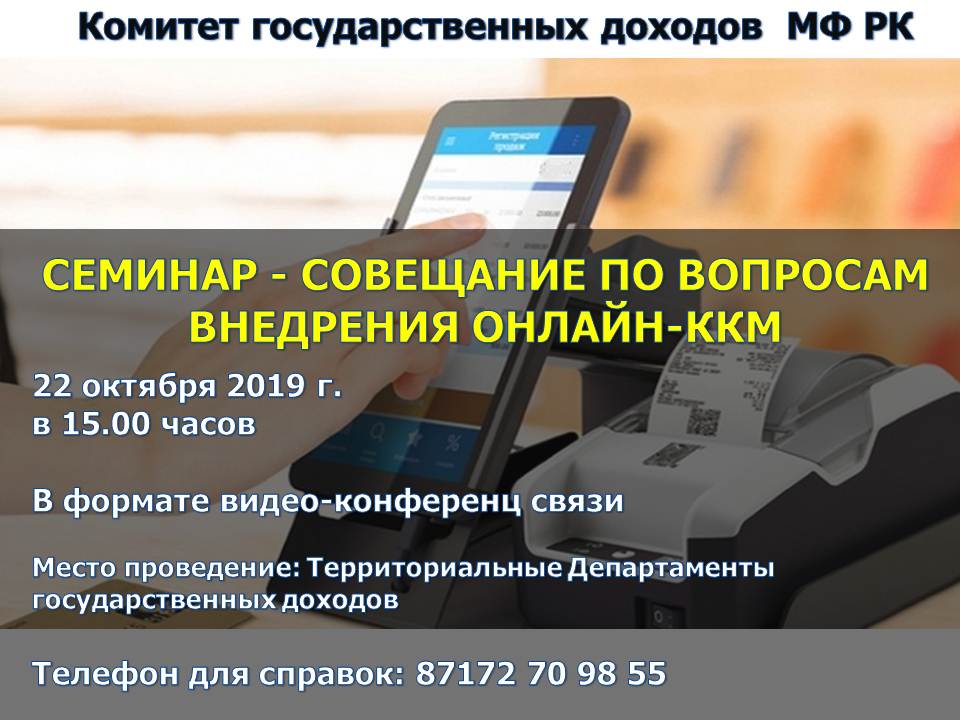 Комитет государственных доходов Министерства финансов Республики Казахстан, сообщает, что 22.10.2019 года в 15.00 часов состоится семинар - совещание по вопросам внедрения онлайн-ККМ.