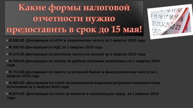 ДГД по г.Алматы сообщает, какие формы налоговой отчетности нужно предоставить в срок до 15 мая 2019г.
