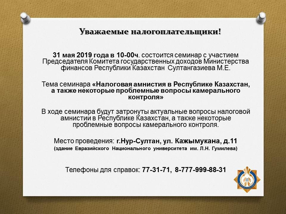 Семинар КГД на тему: "Налоговая амнистия в Республике Казахстан, а также некоторые проблемные вопросы камерального контроля"