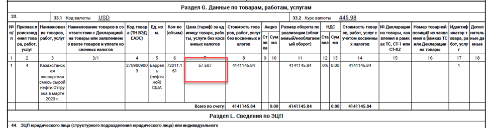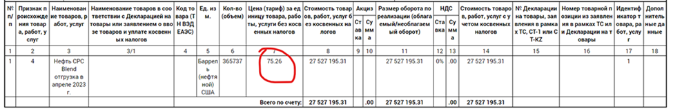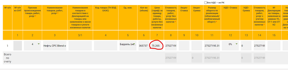 При выписке электронных счетов фактур (ЭСФ) начиная с апреля 2023 г, в графе 7 (Цена (тариф) за единицу товара, работы, услуги) раздела G, система ИС ЭС стала округлять цену до двух значений после запятой. Электронные счета фактуры для реализации сырой нефти выставляются в долларах США. Цены на сорта нефти, согласно контрактам, округляются до трёх значений, так как рассчитываются на основе котировок международных агентств, признанных в Республике Казахстан и отраженных в источниках информации с тремя значениями после запятой.