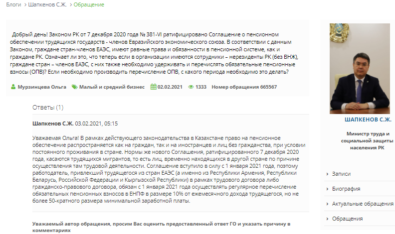 Соглашение вступило в силу с 1 января 2021 года, поэтому работодатель, привлекший трудящегося из стран ЕАЭС (а именно из Республики Армения, Республики Беларусь, Российской Федерации и Кыргызской Республики) в рамках трудового договора либо гражданско-правового договора, обязан с 1 января 2021 года осуществлять регулярное перечисление обязательных пенсионных взносов в ЕНПФ в размере 10% от ежемесячного дохода трудящегося, но не более 50-кратного размера минимальной заработной платы.