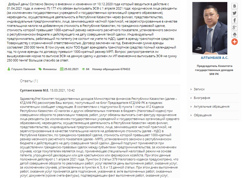 Здравствуйте! Комитет государственных доходов Министерства финансов Республики Казахстан (далее – КГД МФ РК) рассмотрев Ваш вопрос, поступивший на блог Председателя КГД МФ РК в пределах компетенции сообщает следующее.