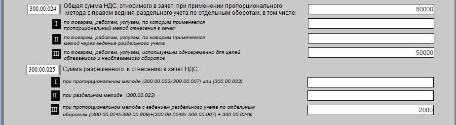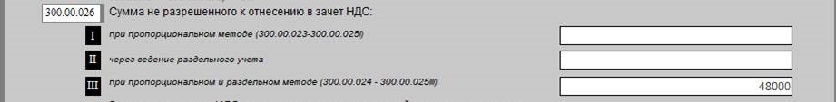 7.строка 300.00.026III не рассчитывается в автоматическом режиме, но при указании суммы показывает ошибку, что расчет не корректен (ниже пример заполнения)? Метод отнесения в зачет НДС у НП пропорциональный с правом ведения раздельного.