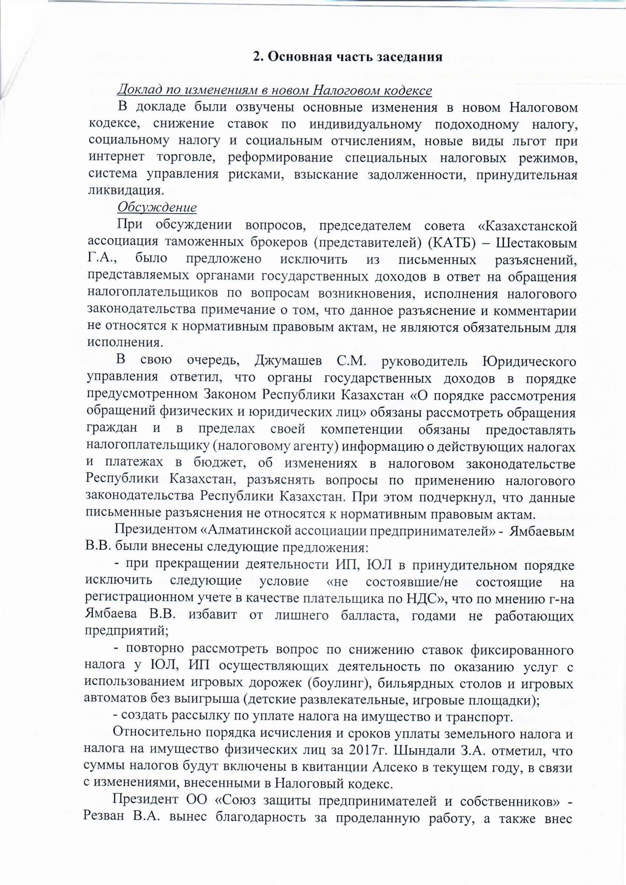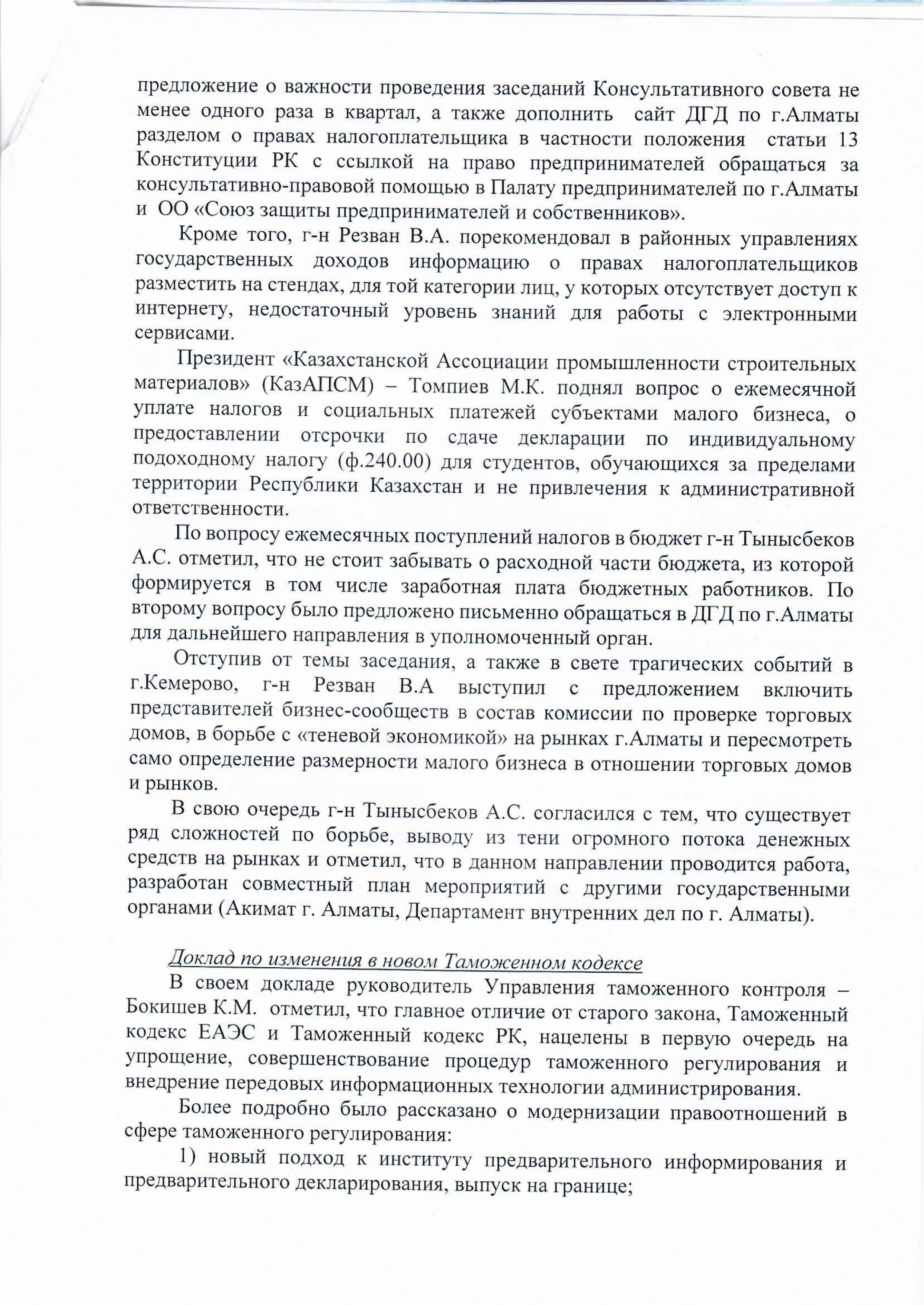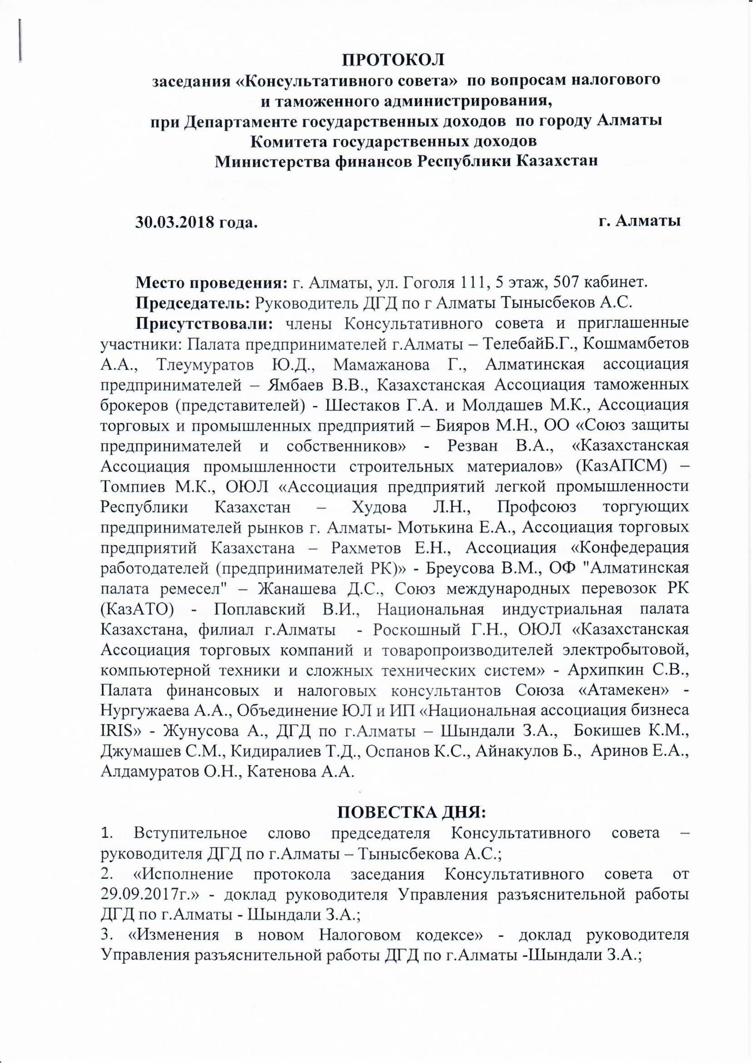 30 марта 2018 года состоялось очередное заседание Консультативного совета по вопросам налогового и таможенного законодательства при Департаменте государственных доходов по г.Алматы. Для обсуждения проблемных вопросов были приглашены представители 16 бизнес сообществ города.
