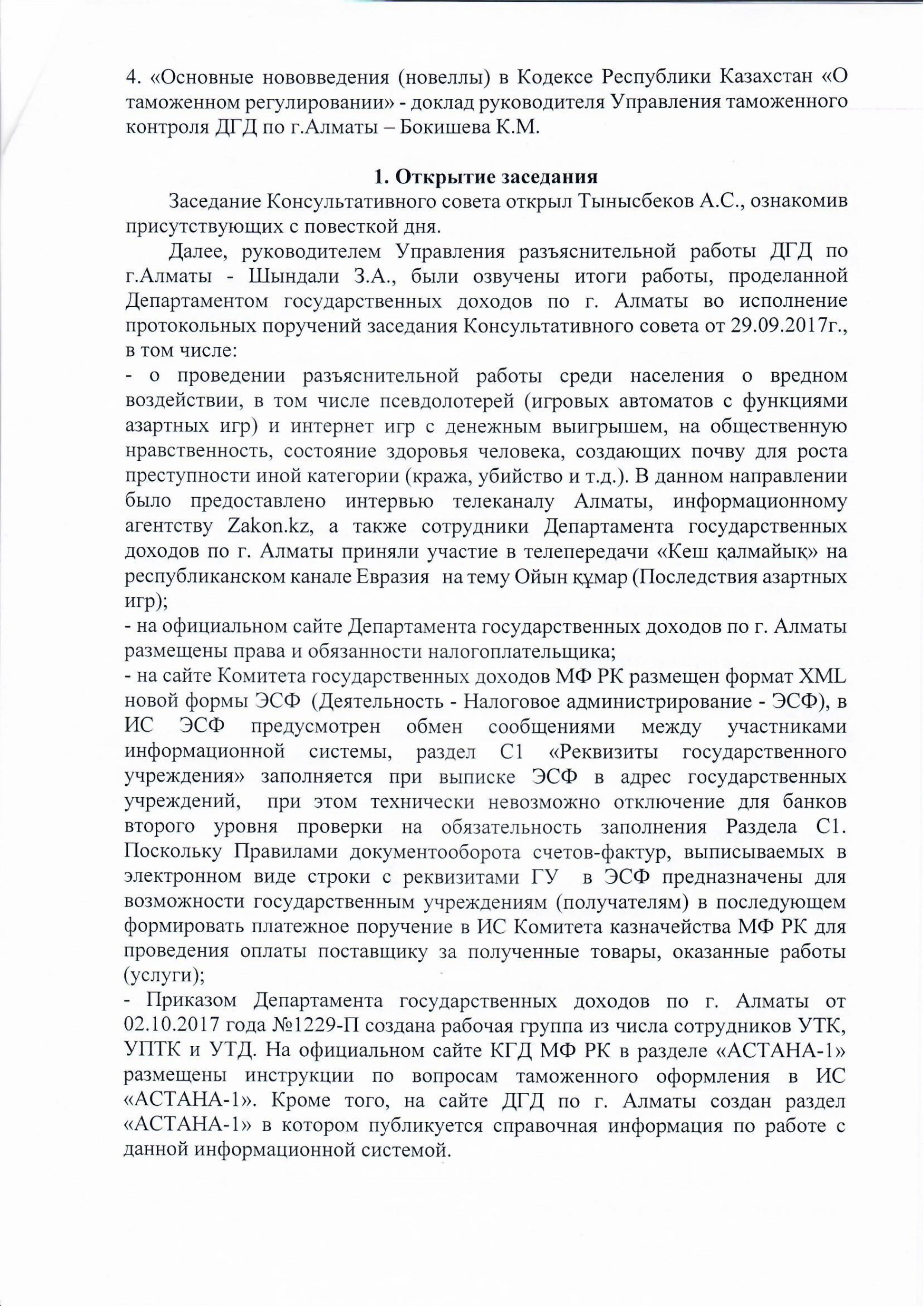 - Приказом Департамента государственных доходов по г. Алматы от 02.10.2017 года №1229-П создана рабочая группа из числа сотрудников Управления таможенного контроля, Управления пост-таможенного контроля и Управления таможенного досмотра. На официальном сайте Комитета государственных доходов МФ РК в разделе «АСТАНА-1» размещены инструкции по вопросам таможенного оформления в ИС «АСТАНА-1». Кроме того, на сайте Департамента государственных доходов по г. Алматы создан раздел «АСТАНА-1» в котором публикуется справочная информация по работе с данной информационной системой.